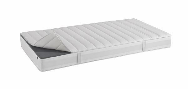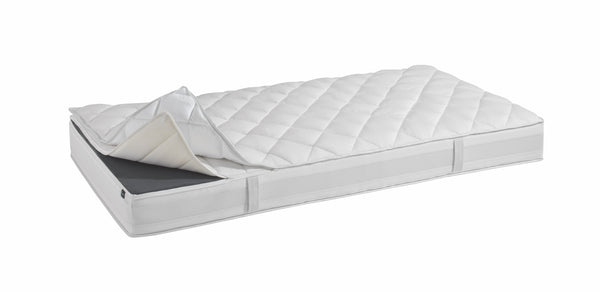 Bellissima-Bezug mit Seide (Oeko-Tex Standard 100). Das Cover lässt sich beidseitig abnehmen und bei Bedarf ersetzen. Waschbar bis zu 60°C (Schonwaschgang). Die Matratzenhülle Luxe ist verstärkt und dient der Formstabilität.