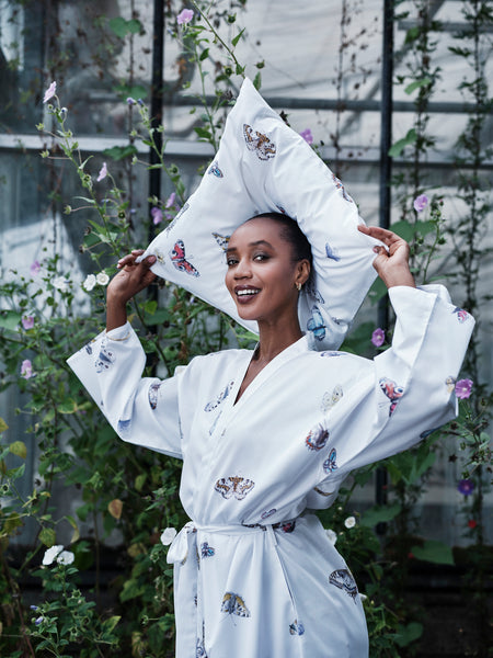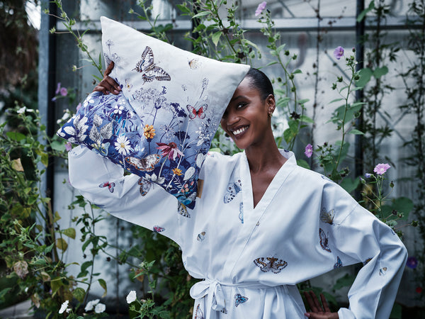 Zart wie ein Flügelschlag entfaltet sich die Schönheit der Schmetterlinge auf dem Design VANESSA. Ihre klangvollen Namen – Admiral, Tagpfauenauge und Distelfalter – erzählen von natürlicher Anmut und Eleganz. Feine Linien und filigrane Punkte zeichnen die Flügel der Edelfalter, die sanft und fast schwerelos auf dem glatten Satin verweilen. In lichten Farbtönen gehalten, verleihen sie dem Schlafzimmer einen Hauch von Sommer und Freiheit.